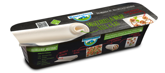 Die dünn ausgerollte Platte aus Mozzarella kann individuell gefüllt, aufgerollt und in Scheiben geschnitten als phantasievolle und leichte Speise zubereitet werden. Der Bayernland Mozzarella Wrap ist außerdem hervorragend geeignet zum Überbacken von Nudelgerichten oder Aufläufen.